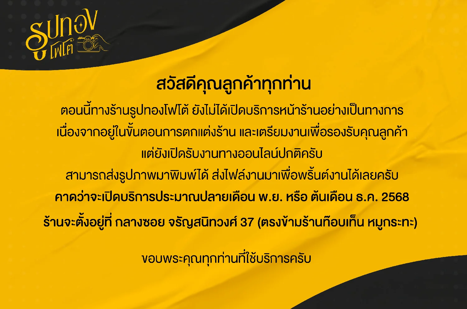 ให้ ‘รูปทอง โฟโต้’ เป็นส่วนหนึ่งในการเก็บเรื่องราวดีๆ ของคุณไว้ให้ยาวนาน”